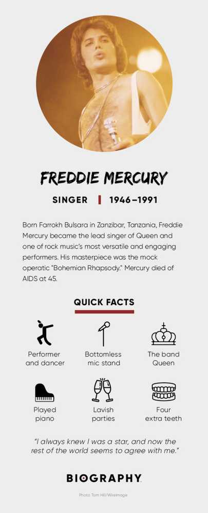 Freddie Mercury var en singer-songwriter og musiker hvis musikk nådde toppen av U.S. og Britiske hitlister på 1970- og 1980-tallet. Som frontmann av Queen var Mercury en av de mest talentfulle og nyskapende sangere fra rocketiden. Født Farrokh Bulsara i Tanzania, studerte Mercury piano på internatskole i India, og ble deretter venn med en rekke musikere i London's Ealing College of Art. Kvikksølv døde av AIDS-relatert bronkial lungebetennelse 24. november 1991, 45 år gammel.
